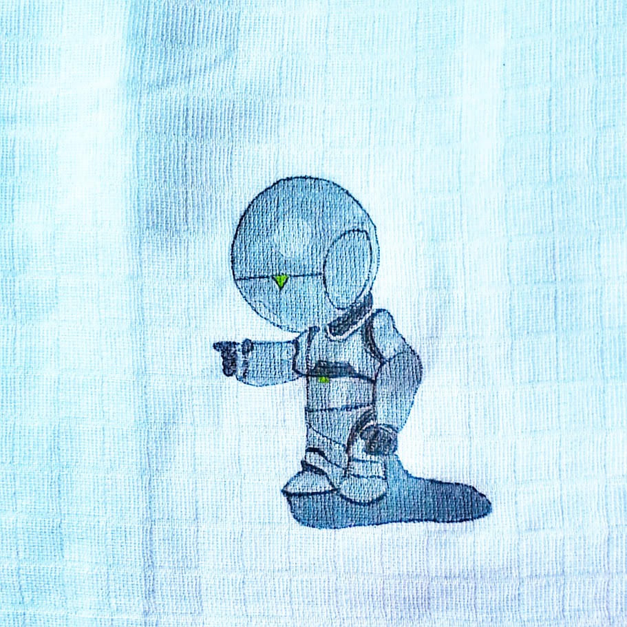 Bálintnak (1,5) nagyon megtetszett a Galaxis útikalauz stopposoknak c. opusz film változatában lévő #Marvin robot figurája, ami most a háttérképem. Csilla felfestette egy textilpelenka sarkára.